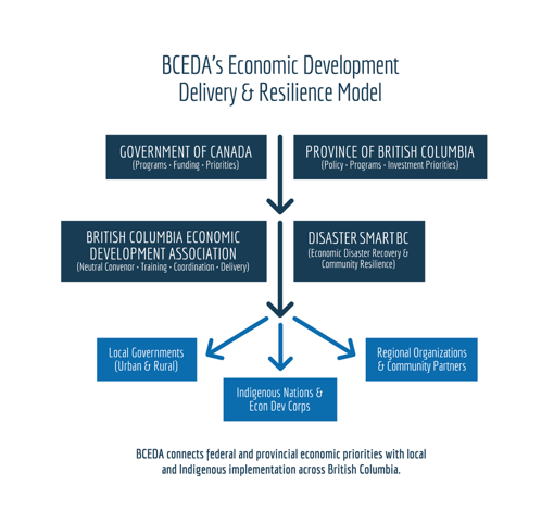 The model below illustrates how BCEDA connects federal and provincial economic priorities with local governments, Indigenous Nations, and regional organizations across British Columbia. It also highlights our role in economic disaster recovery and community resilience through DisasterSmartBC.